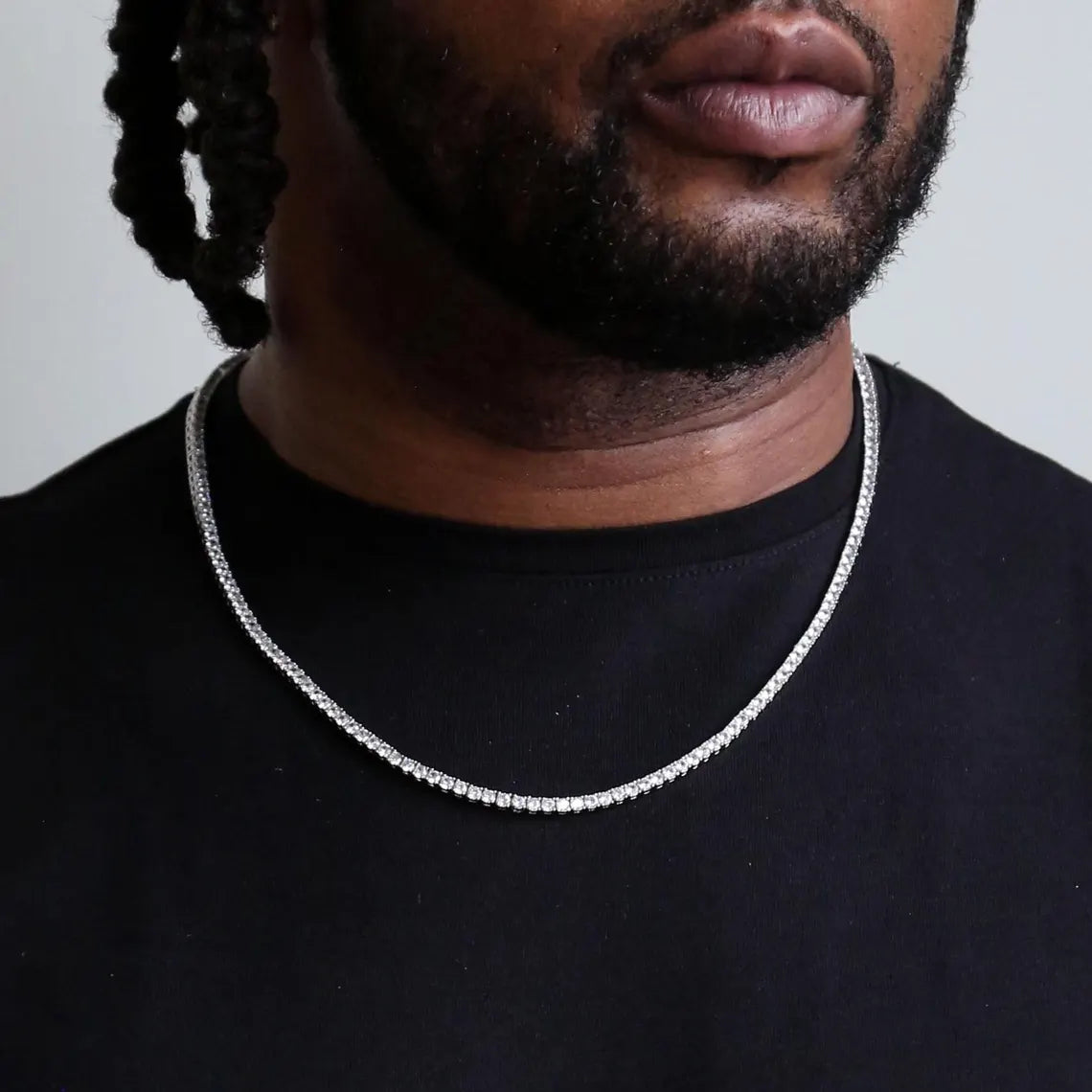 A true essential, the 3mm Tennis Necklace is designed for everyday sophistication. Its clean design, lined with premium 5A CZ stones, catches the light with effortless brilliance. Finished in 18k white gold plating and secured with a reliable clasp, it delivers a refined look that transitions seamlessly from casual to special occasions.